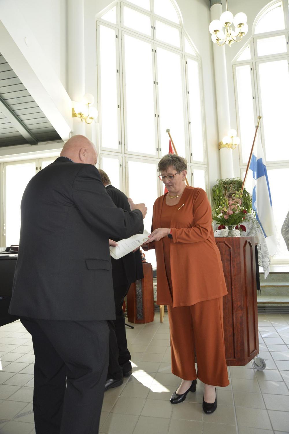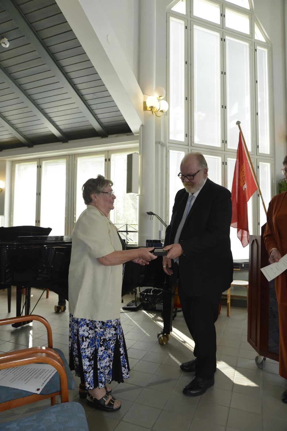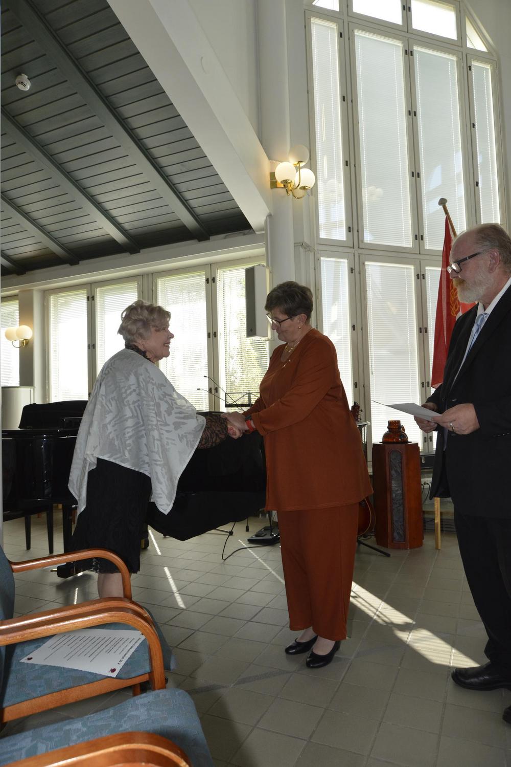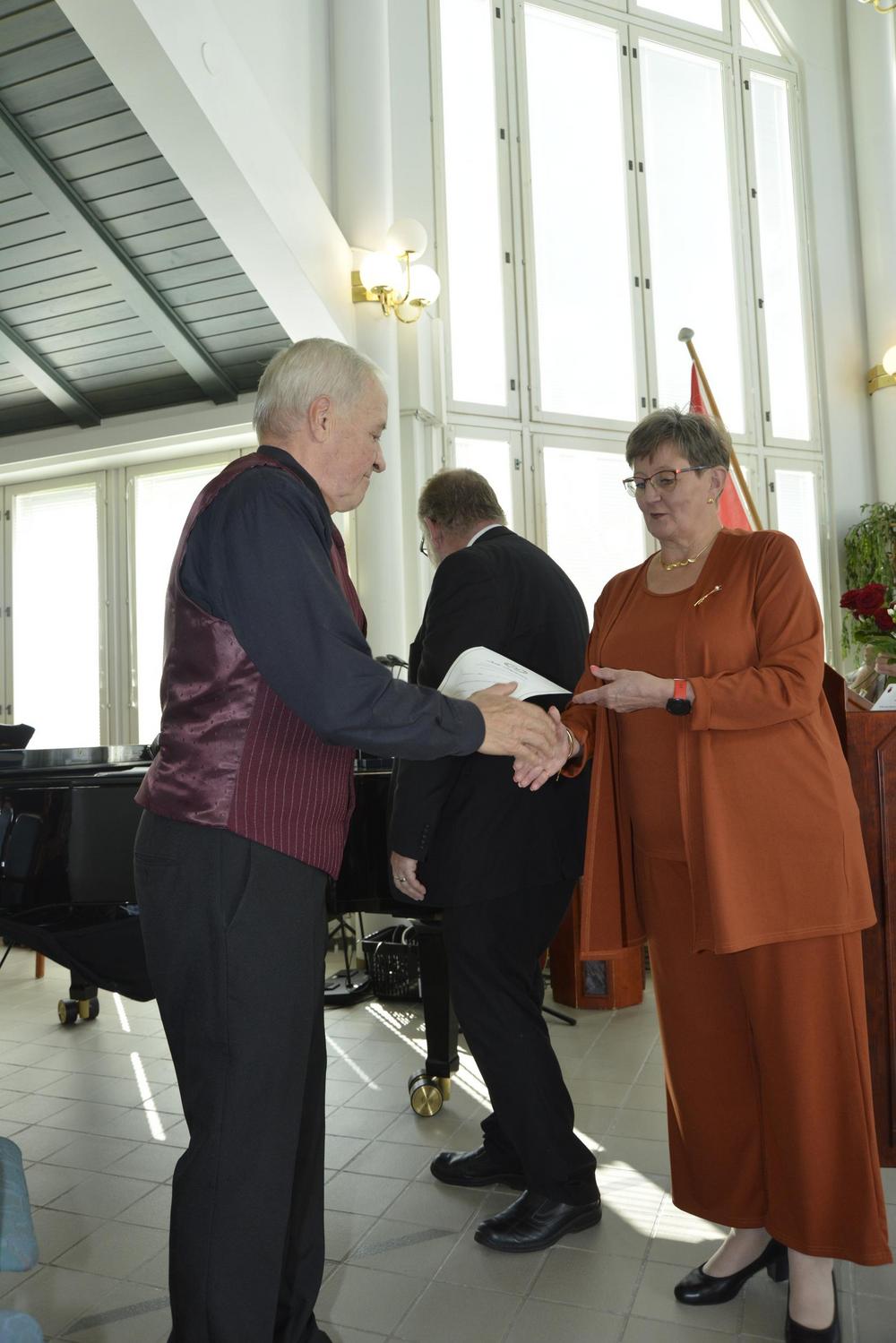 Lopuksi jaettiin ansiomerkit yhdistyksen ansioituneille. Palkittujen joukossa oli 16 aktiivista jäsentä, jotka saivat tunnustusmitaleja sekä kultaisia ja hopeisia ansiomerkkejä.