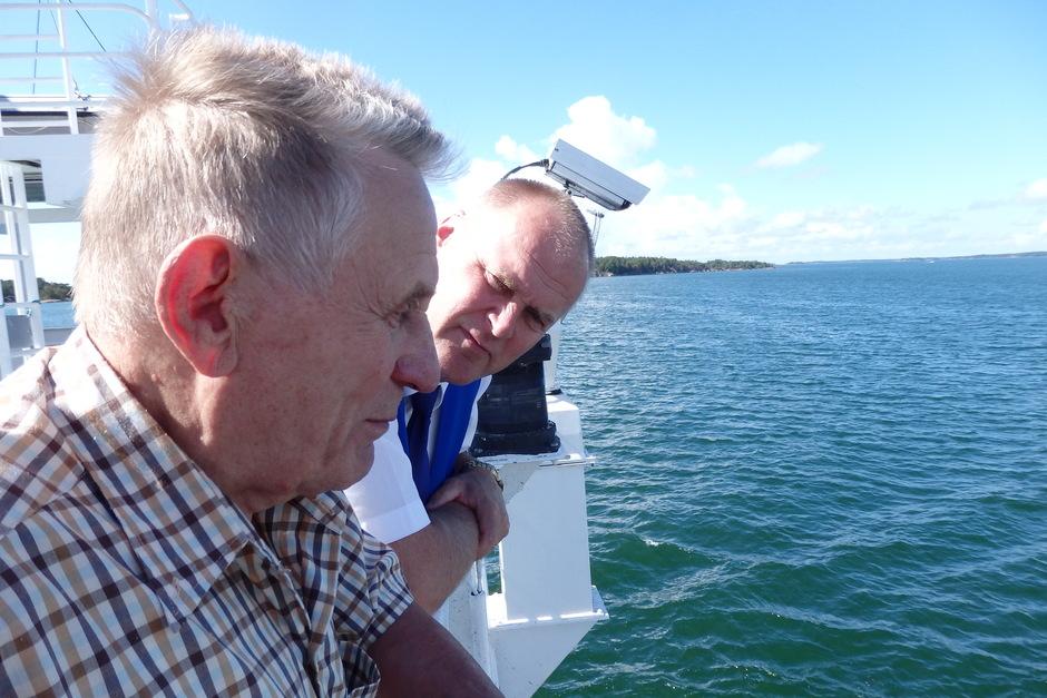 Alpo ja kuljettajamme Markku saarien välisellä yhteysaluksella.