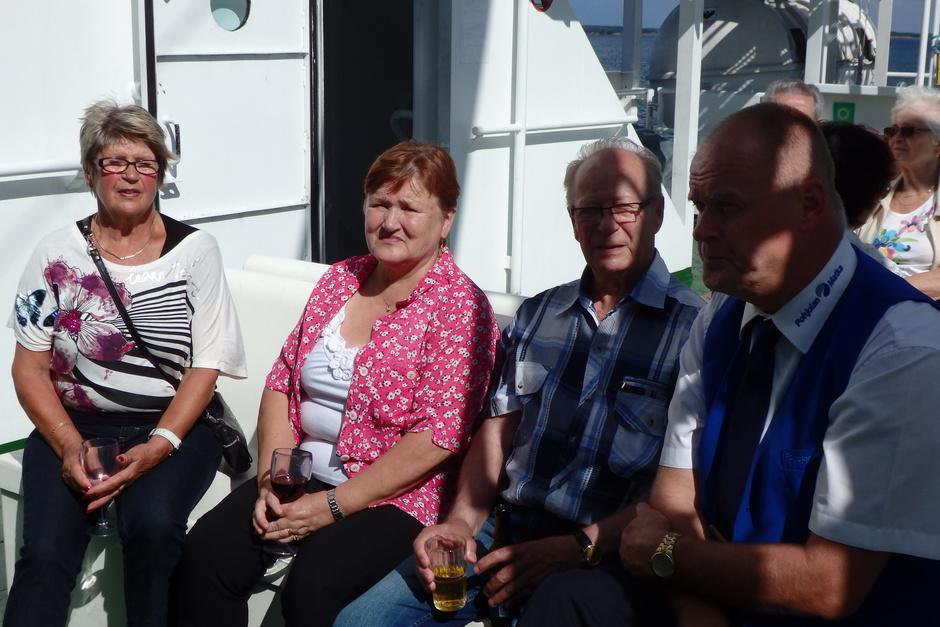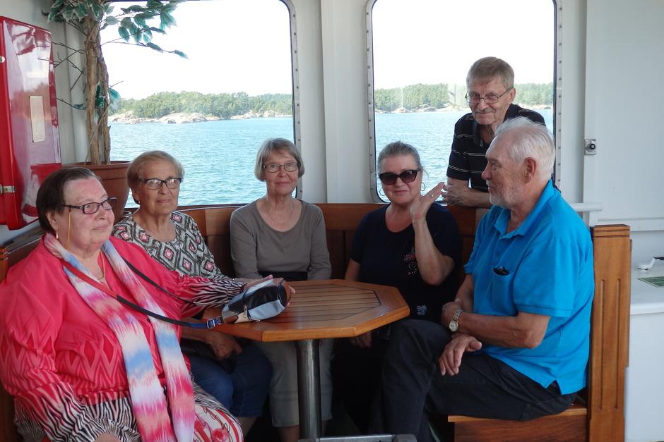Aili, Eevi, Helena ja Alpo. Juttu luistaa merimatkan aikana.
