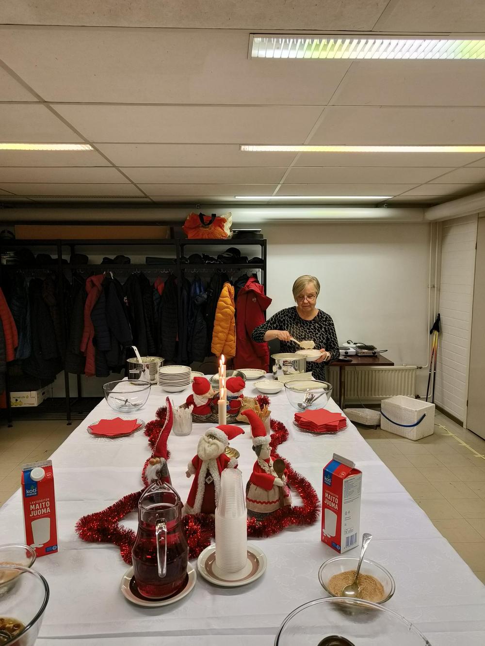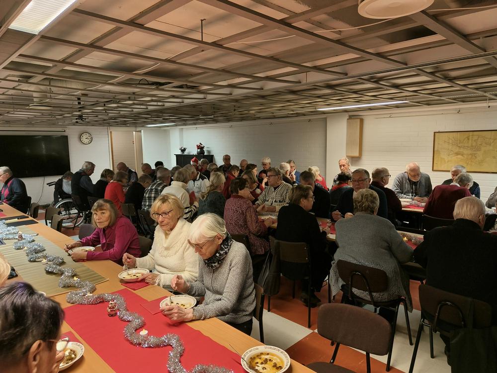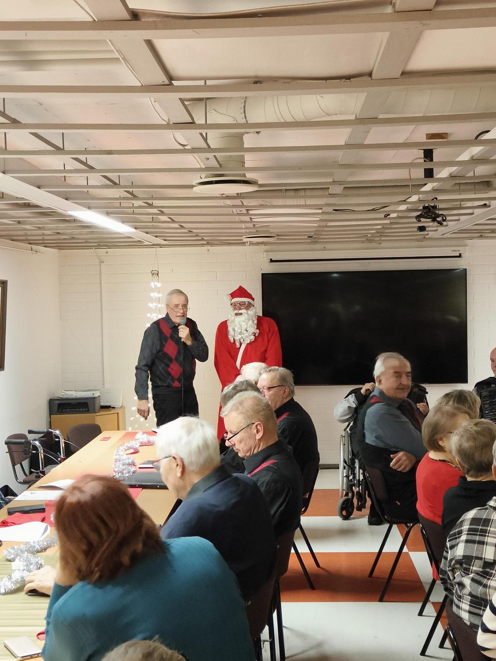 Puurojuhlaa vietettiin noin 100 eläkkeensaajan joukolla. Emännät olivat keittäneet maittavan riisipuuron rusinasopan kera. Aulis juonsi tuttuun tapaan tiaisuuden. Kuoromme Harmaat ja Kipakat esiintyivät ja olihan meillä myös yhteisten Joululaulujen hetki . Emännät tarjosivat vielä torttukahvit. Ja tulihan se Joulupukkikin tontuineen ja paketteineen paikalle.