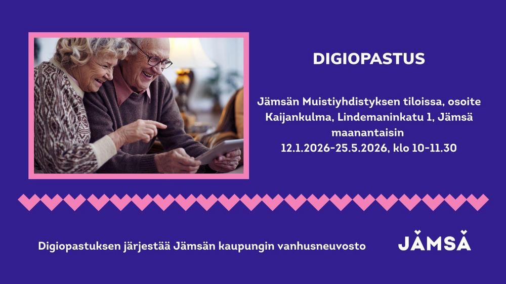 Viikoittainen digiopastus alkaa jatkuu 25.5.2026 saakka. Opastusta järjestetään maanantaisin klo 10–11.30 Jämsän Muistiyhdistyksen tiloissa Kaijankulmassa (Lindemaninkatu 1, Jämsä). Viikoittainen…